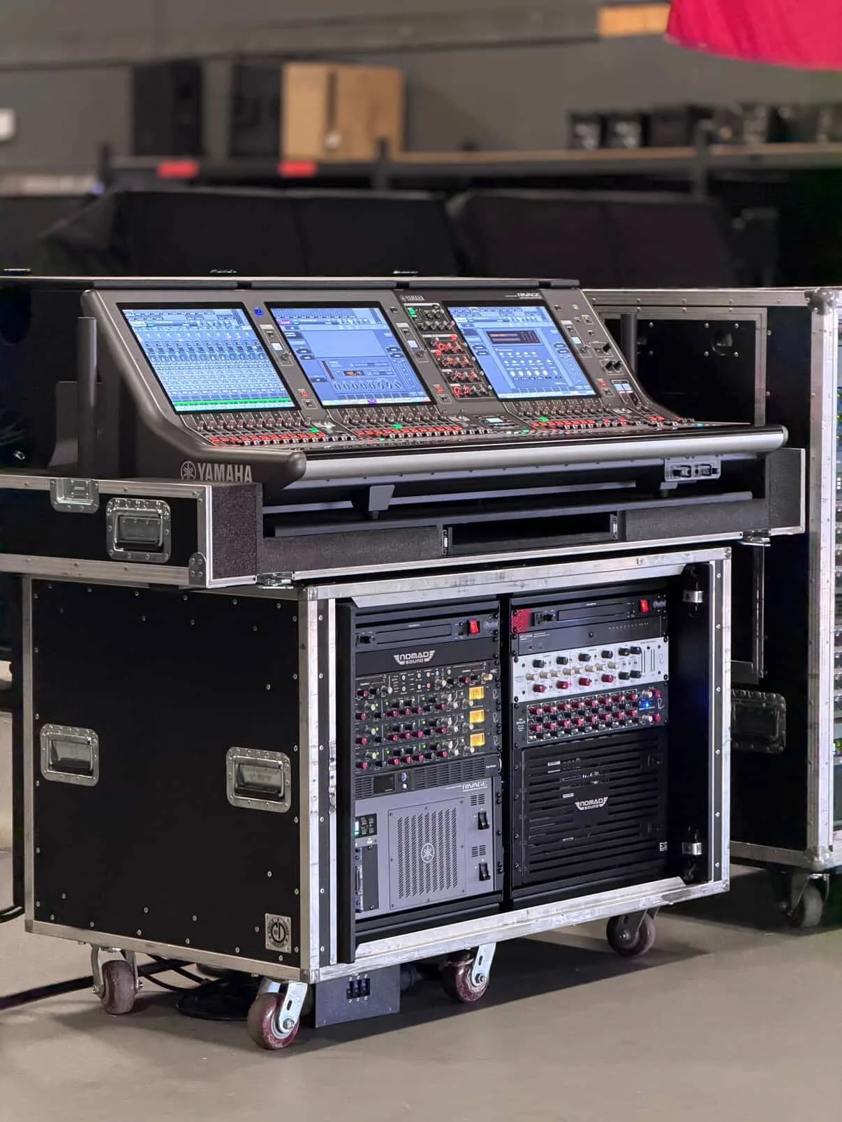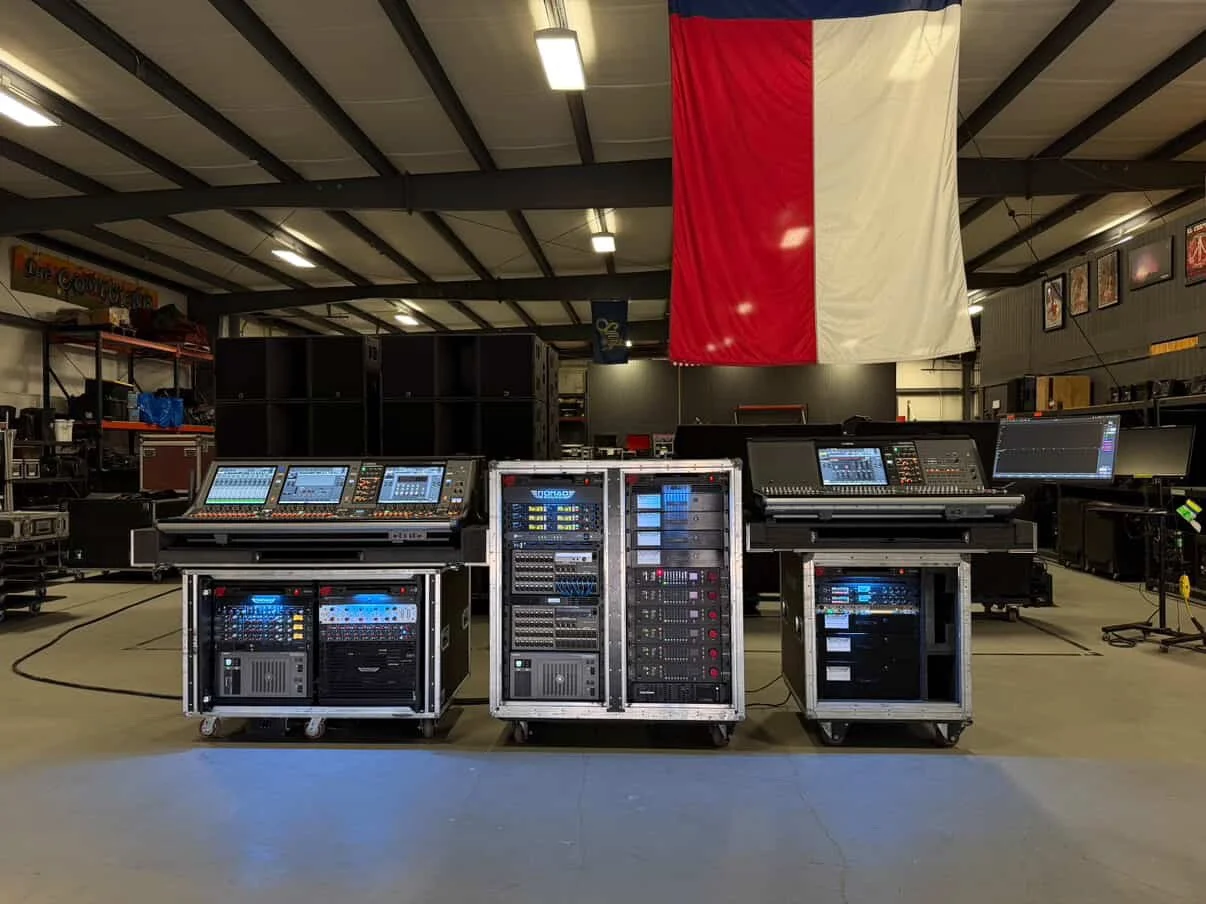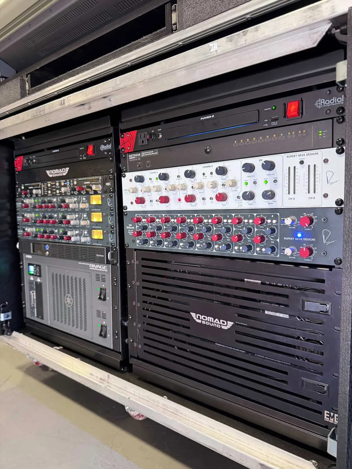 Shelford Channels + RMP-D8s on the front end, 5059 Satellite + MBP + MBC on the back end, all tied together with a Yamaha Rivage desk.